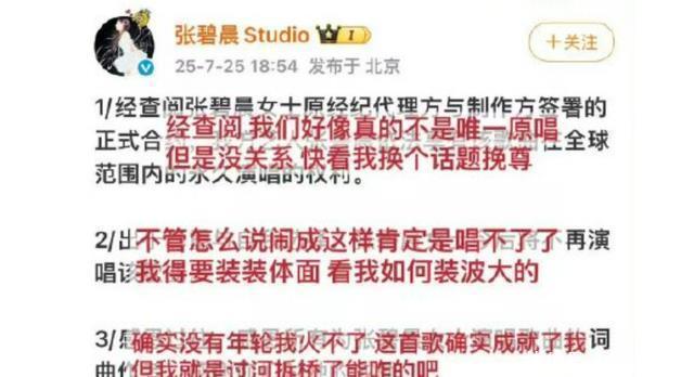 哈哈,张碧晨这边又上热搜了,最新声名里说“经查阅张碧晨女士原经纪代理方与制作方签署的追究合约里显现,张碧晨照章享有该歌词在全球规模内的始终演唱权力。但出于尊重和自我吸收,以后不再演该歌曲……” 这个声名里,一次也莫得提《年轮》,只说了“该歌曲”,哈哈,这是啥原理?而况还说“经查阅追究合约”,那之前她们是没看合约就说我方是“唯独原创”吗? 嗅觉还是有点自欺欺人,可能是看公论有点偏向汪苏泷,不思有损我方的形象,是以有点急于知旨趣解,以正东谈主设。